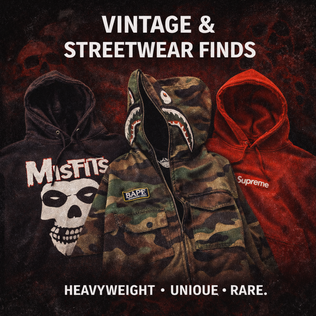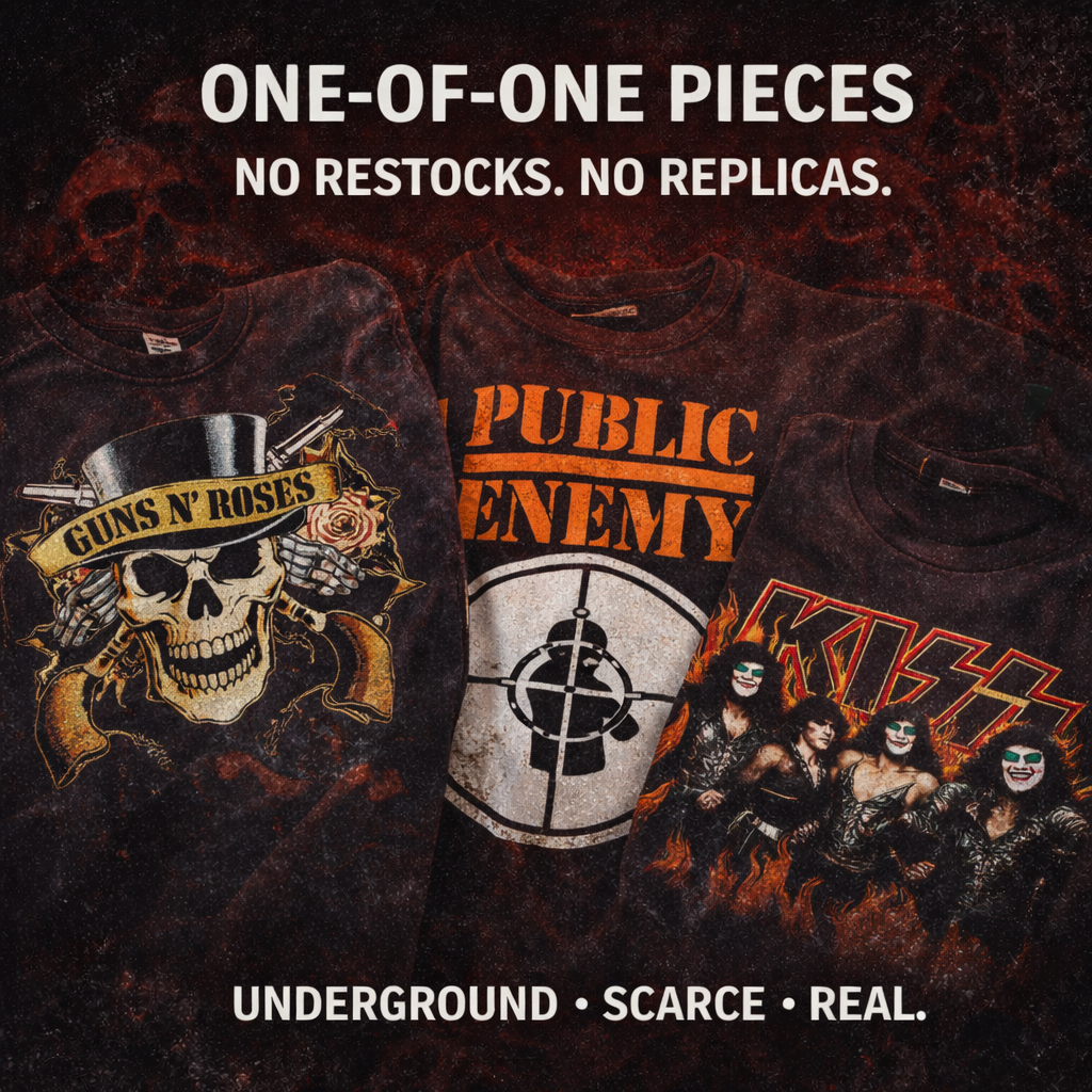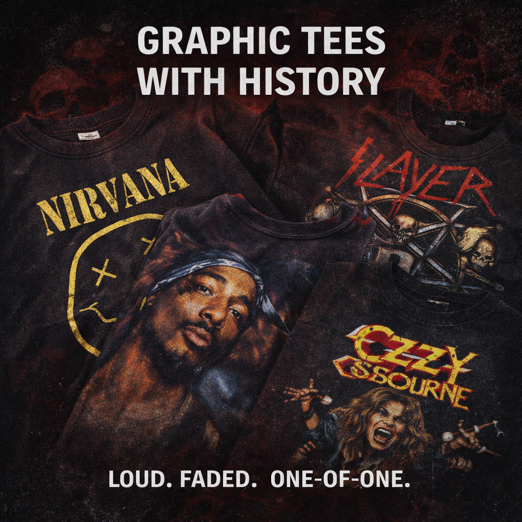 We curate graphic tees, vintage clothing, and streetwear with history, character, and attitude. Every piece is hand-selected. Most items are one-of-one. When it’s gone, it’s gone.
